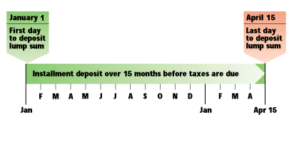 You can put money into your IRA in a lump sum, or spread your contribution out over up to 15 months. You may put in the whole amount the first day you can, January 1 of the tax year you’re making the contribution for. Or, if you’re like most people, you’re more apt to make the deposit on the last possible day, which is April 15 for the previous tax year.
